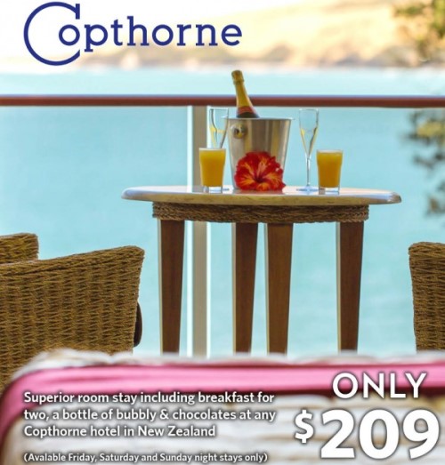 Copthorne Pure Pampering Deal – 1 Night – 2 people – Everyone loves romantic weekend getaways. Slip away for a weekend of romance and pampering on this indulgent break for two at any participating Copthorne Hotel and Resort in New Zealand. Package Details: One night Superior room accommodation for two at any participating Copthorne Hotel and Resort in New Zealand. (Available Friday, Saturday and Sunday night stays only) Full cooked Breakfast for two – Bottle of Bubbly – Chocolates – Auckland Copthorne Hotel Auckland City Bay of Islands Copthorne Hotel and Resort Bay of Islands Palmerston North Copthorne Hotel Palmerston North Queenstown Copthorne Hotel and Resort Queenstown Lakefront Copthorne Hotel & Apartments Queenstown Lakeview Wairarapa Copthorne Hotel and Resort Solway Park Wairarapa Wellington Copthorne Hotel Wellington Oriental Bay This is an “AwaytoGo” voucher. Please allow up to 48 hours for delivery of this voucher and NOTE this ‘AwaytoGo’ voucher cannot be refunded or exchanged through the Gifts to Remember system. Please Refer to the ‘Key Information’ tab for all other AwaytoGo Terms & Conditions.