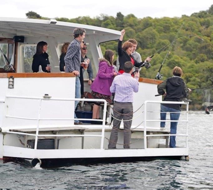 Trout Fishing Excursion – 3 hours – 8 people – Experience trolling or harling on Lake Taupo – the largest self sustaining trout fishery in Australasia. Gift experience with broad appeal. Christmas gift for a family or group of guys. Fish for Trout on lake Taupo with the experts. These guides have been taking clients fishing in Taupo for more than 35 years. Lake Taupo offers excellent trout fishing all year round; there is no closed season on the Lake. We use a combination of downriggers, harling and trolling on board – depending on the time of day, weather and client time restraints. You do not need any experience or fishing gear, our experienced staff are there to help. Trout averages about 4 pounds and a typical excursion on the Lake will see your crew prepare your catch for a delicious snack either barbequed or sashimi style. You can even have your catch smoked and couriered to your destination in New Zealand at a small cost. All charter boats come equipped with galley, full bar facilities, fishing gear, music systems, flush toilets, lounge style cabins and safety equipment. Our friendly and professional staff will ensure your group has the trip of a lifetime. Trout fishing licences are compulsory (one per angler) and can be purchased on board your launch for $20.00.